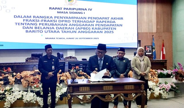 SeputarDuniakalteng.com, MUARA TEWEH – Penjabat (Pj) Bupati Barito Utara, Indra Gunawan menyampaikan pidato penutup sekaligus pendapat akhir pemerintah daerah atas pembahasan Rancangan Peraturan Daerah tentang Perubahan APBD Kabupaten Barito Utara Tahun Anggaran 2025 dalam Rapat Paripurna IV Masa Sidang I di ruang sidang DPRD, Jumat 26 September 2025.