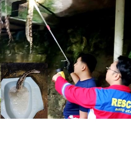 Setelah menerima laporan, petugas piket jaga Disdamkarmat Barito Utara segera bergerak cepat menuju lokasi kejadian. Tim evakuasi yang dipimpin oleh petugas terlatih langsung menuju rumah yang dilaporkan dan menemukan ular tersebut terperangkap dalam lubang closet.