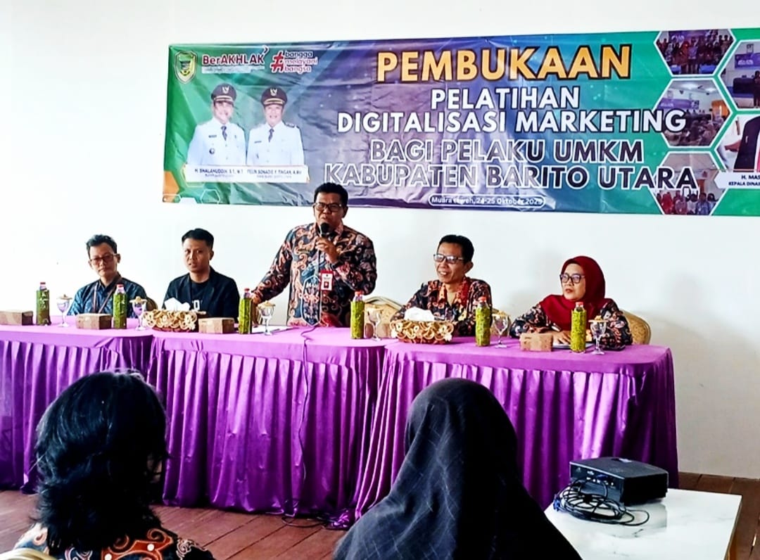 Seputarduniakalteng.com, MUARA TEWEH – Disnakertranskop UKM Barito Utara (Barut) menggelar Pelatihan Digitalisasi Marketing bagi pelaku UMKM, di Aula Tepian Kolam Barakati, Jumat (24/10/2025).