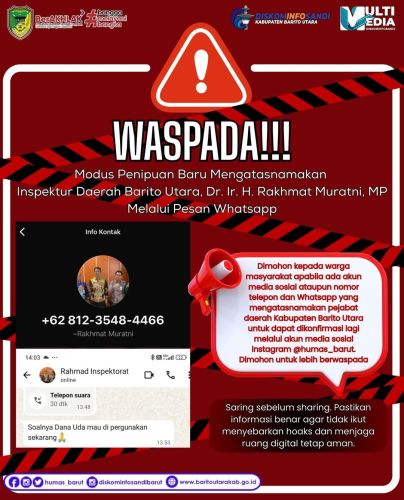 Selain itu, masyarakat juga diimbau untuk segera melaporkan akun media sosial atau nomor kontak yang diduga melakukan penipuan kepada pihak berwenang atau melalui kanal pengaduan resmi Pemerintah Kabupaten Barito Utara guna mencegah adanya korban lainnya. (Bu)