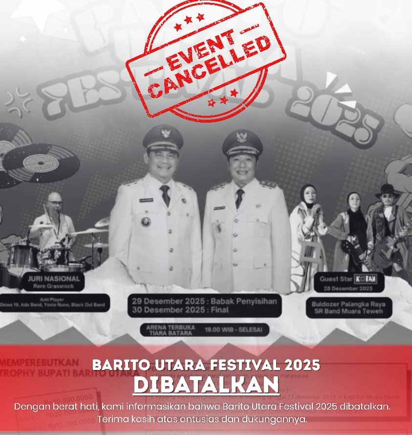 SeputarDuniakalteng.com, MUARA TEWEH – Semua kegiatan hiburan, seni, dan musik dalam Festival Barito Utara 2025 resmi dibatalkan. Keputusan ini diambil Pemerintah Kabupaten melalui Disbudparpora atas petunjuk Bupati, sebagai bentuk rasa berduka bersama dan keprihatinan terhadap saudara yang terkena bencana di Aceh dan Sumatera.